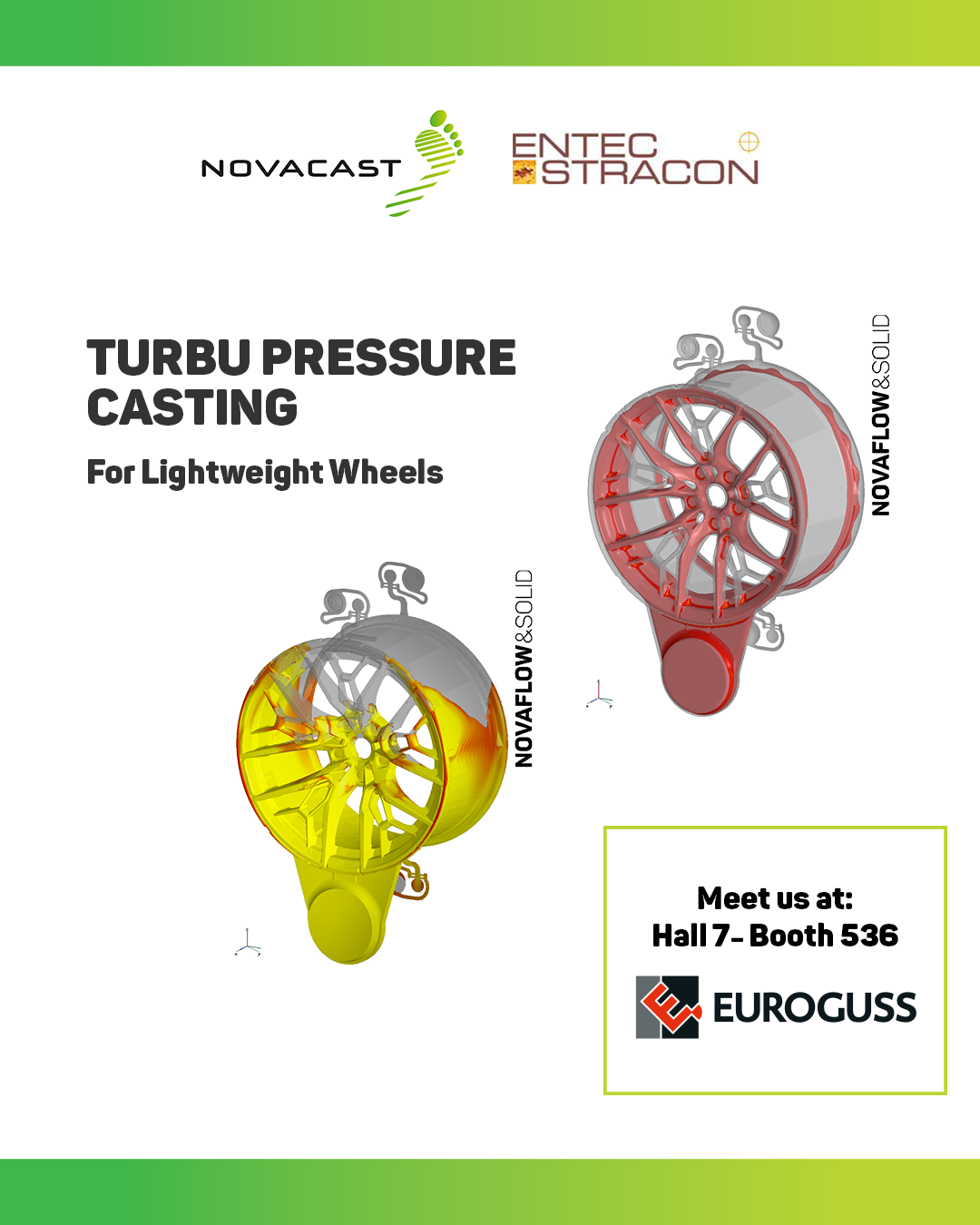 At the NovaCast booth, together with ENTEC-STRACON, we will showcase TURBU PRESSURE CASTING — an advanced wheel casting technology for lightweight wheels, supported by NovaFlow&Solid.